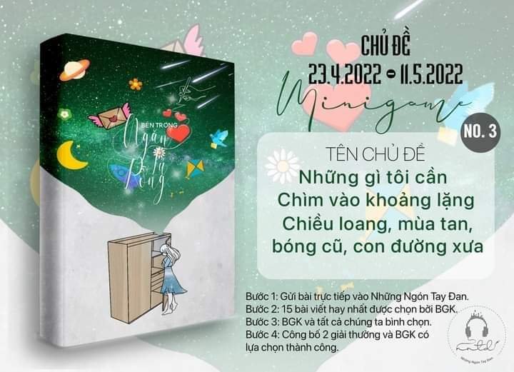 • Các bạn cứ nhiệt tình chia sẻ những cảm xúc cá nhân qua các chủ đề của minigame, bạn có thể tham gia hơn trăm bài cũng được nhé. Chỉ cần theo đúng quy định của minigame về #, chủ đề, số chữ và đặc biệt không cần phải kéo tương tác trong phần bài chia sẻ trên group, hãy viết thật hay để được 5 BGK chọn đúng bài viết của mình.
