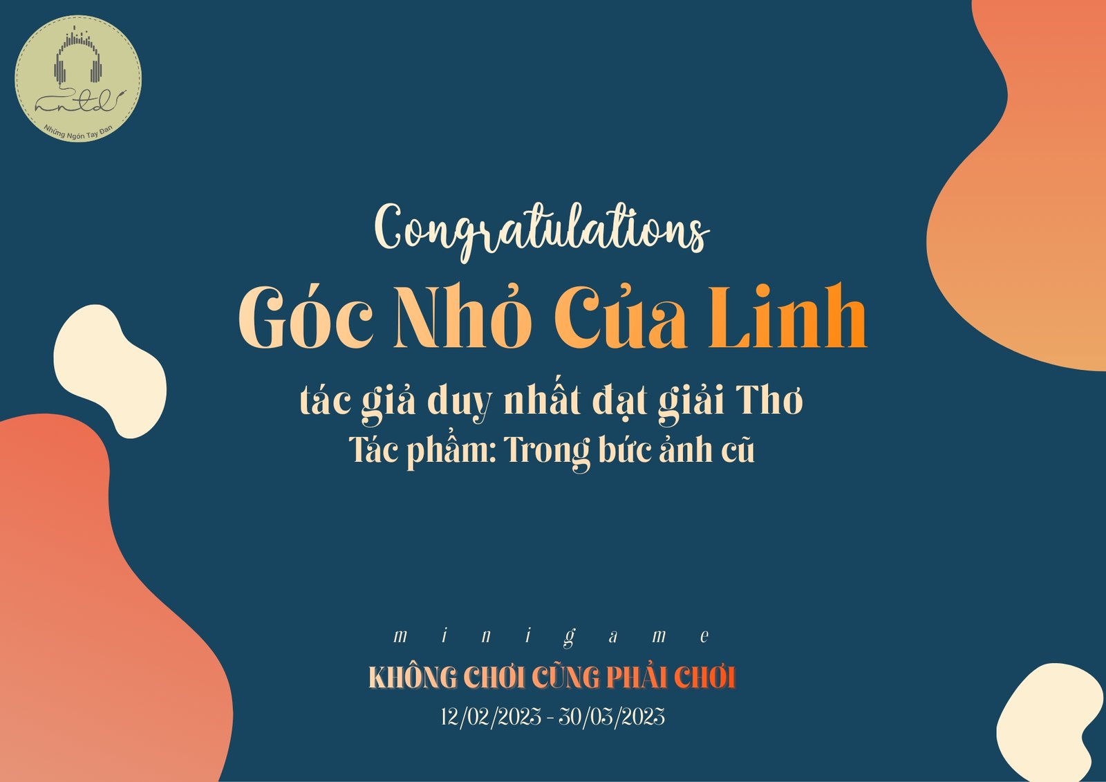 Tay Đan xin chúc mừng Góc nhỏ của Linh đã trở thành tác giả DUY NHẤT đạt giải Thơ 40 – Minigame Không chơi cũng phải chơi.