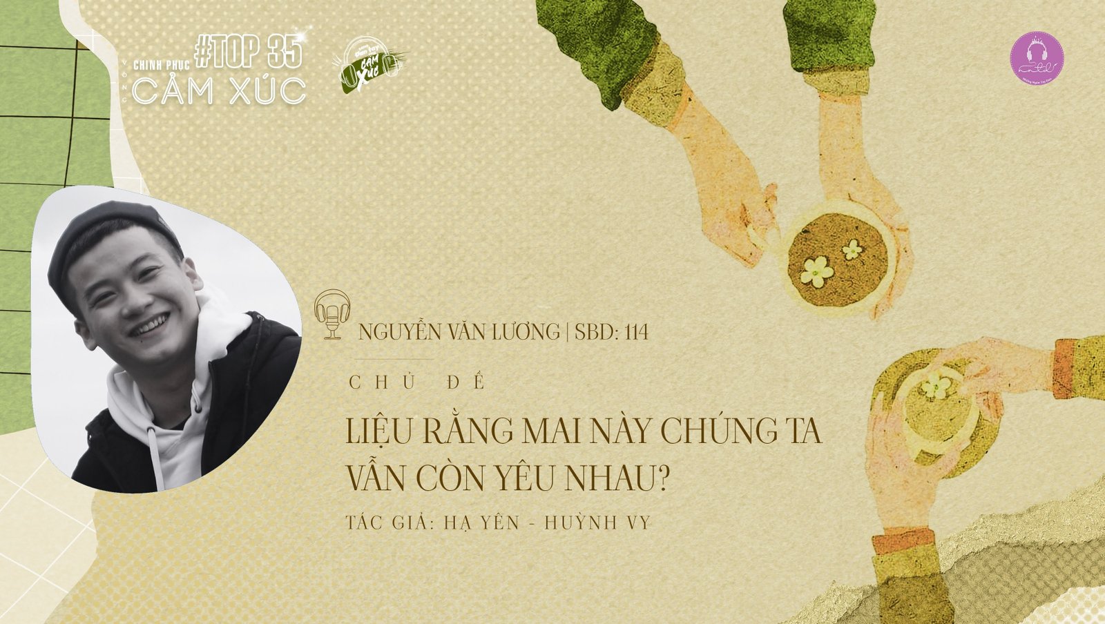 Các bạn đang đến với phần dự thi Đan Tay Cùng Cảm Xúc – Vòng Chung kết 1 được tổ chức bởi nhóm Những Ngón Tay Đan và phát trên kênh youtube Những Ngón Tay Đan. Sau đây là phần dự thi của thí sinh Nguyễn Văn Lương SBD 114 với hai tác phẩm Chúng ta của mai này, tác giả Hạ Yên và Cảm ơn anh vì đã xuất hiện trong thanh xuân của em, tác giả Huỳnh Vy. Xin mời quý vị cùng lắng nghe.